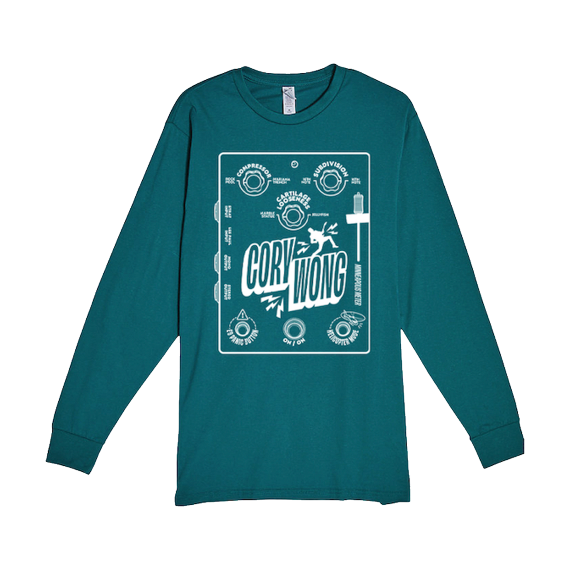 Cory Wong's pedal design screen printed on a teal 100% pre-shrunk cotton long sleeve t-shirt with custom neck label. True to size fit.